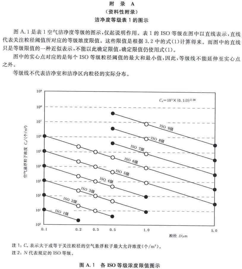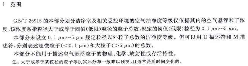 GB/T25915的本部分劃分潔凈室及相關(guān)受控環(huán)境的空氣潔凈度等級僅依據(jù)其內(nèi)的空氣懸浮粒子濃度,該濃度系指粒徑大于或扥估閾值(低限)粒徑為0.1μm~5μm規(guī)定粒徑以外粒子總數(shù)的潔凈度等級。但可以用U描述符合M描述符,分別表述超微粒子(<0.1μm)和大粒子(>5μm)的總數(shù)。